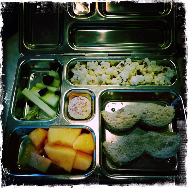 This week we made special lunches each day…because the hot lunch kids are having special lunches. We had tree sandwiches, snowmen, snowballs…but today’s request…moustaches please! That’s my girl π